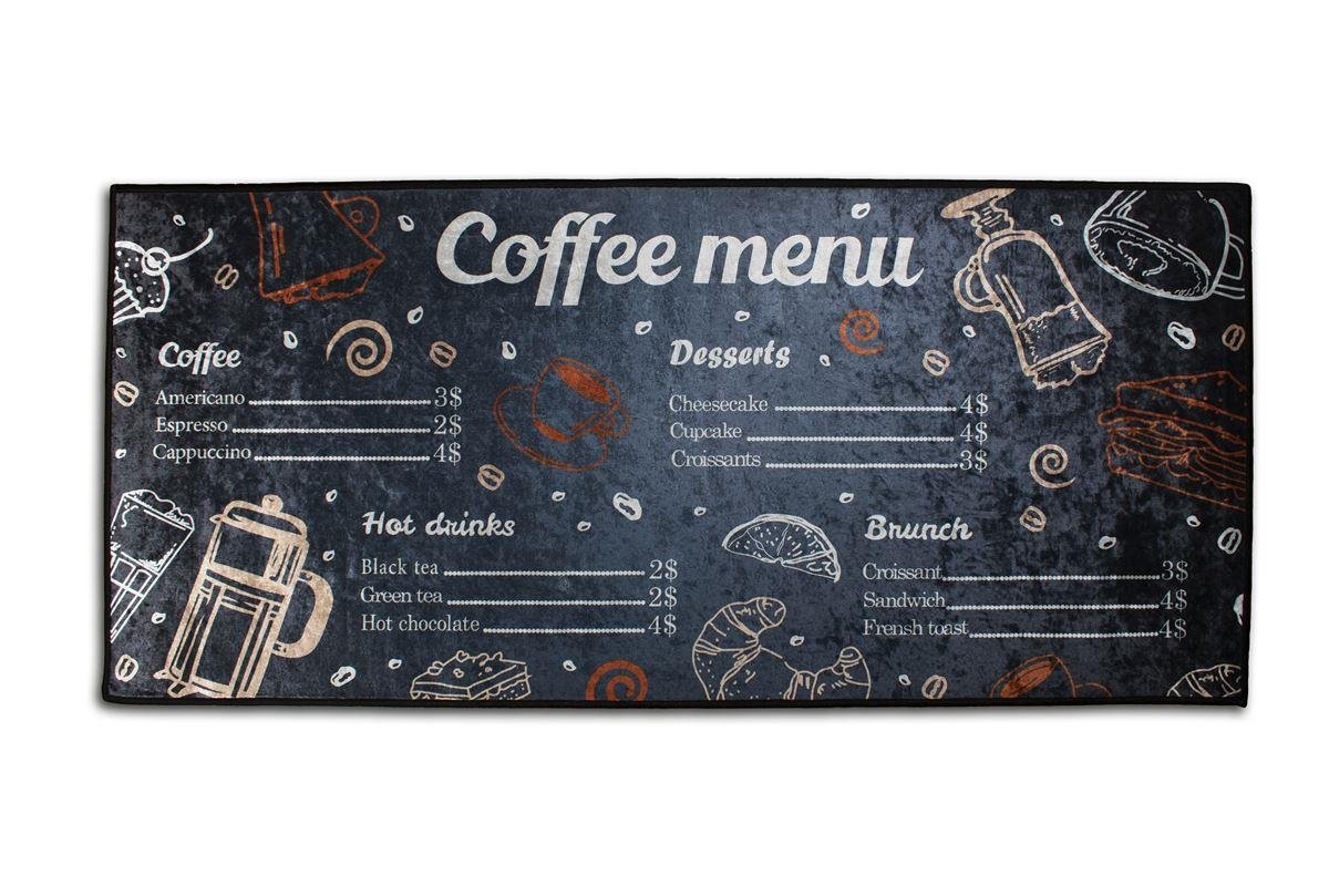 Χαλάκι Κουζίνας διαστάσεων 67Χ150 cm, με αντιολισθητικό επίστρωμα Dots Backing και απεικόνιση μενού καφετέριας. Πρακτικό, ασφαλές, αλλά και διακοσμητικό για τη κουζίνα του σπιτιού σας. Συσκευασία Polybag.