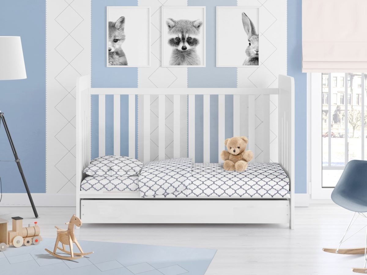 Σετ 3 τεμαχίων που περιέχει: Βρεφικά Σεντονάκια 120Χ160 κούνιας 2 τεμ. και 1 τεμ Μαξιλαροθηκη 35Χ45.Ύφασμα βαμβακι 100% TC 144 Εμπριμέ με χαρούμενα χρώματα και παραστάσεις-Συσκευασία Δώρου Κουτί Πολυτελείας