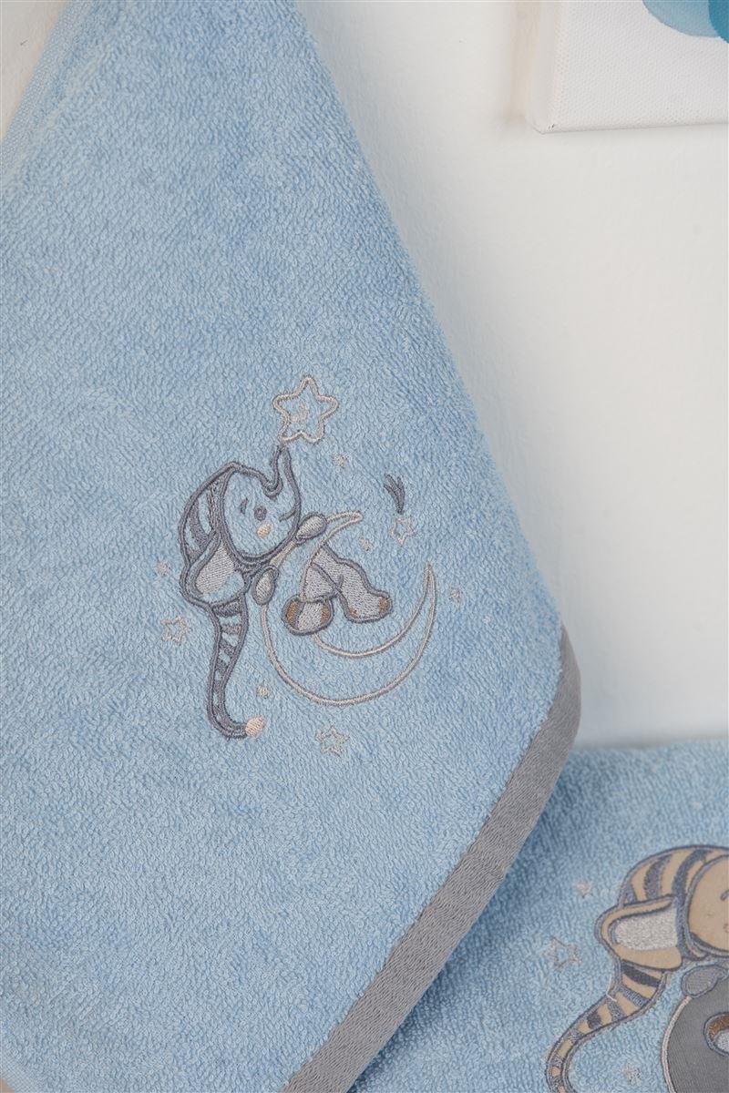 Σετ βρεφικές πετσέτες μπάνιου που περιέχει : 1 τεμάχιο πετσέτα χειρός διαστάσεων 30X50 cm και 1 τεμάχιο πετσέτα μπάνιου διαστάσεων 70X140 cm.Οι πετσέτες έχουν χρωματιστή υφασμάτινη φάσα και σχέδιο με κέντημα και είναι κατασκευασμένες από 100% βαμβάκερη πετσέτα 400 gsm, υψηλής απορροφητικότητας. Συσκευασία Δώρου Κουτί Πολυτελείας.