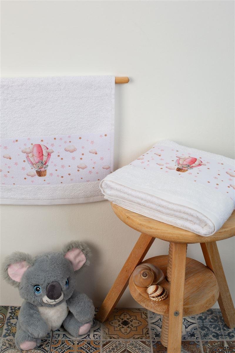 Σετ βρεφικές πετσέτες μπάνιου που περιέχει : 1 τεμάχιο πετσέτα χειρός διαστάσεων 30X50 cm και 1 τεμάχιο πετσέτα μπάνιου διαστάσεων 70X140 cm. Οι πετσέτες έχουν υφασμάτινη φάσα με ψηφιακά τυπωμένα χρωματιστά σχέδια και είναι κατασκευασμένες από 100% βαμβάκερη πετσέτα 400 gsm, υψηλής απορροφητικότητας. Συσκευασία Δώρου Κουτί Πολυτελείας.