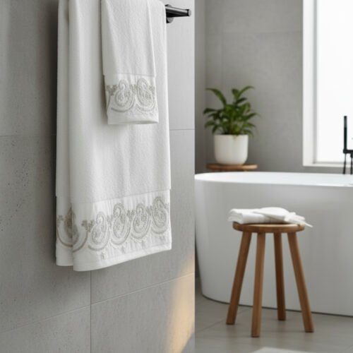 Σετ Πετσέτες Μπανιου MAIRA από ύφασμα 100% βαμβάκι με κεντητή δαντέλα 450 γραμμαρίων ανά m². Το σετ περιλαμβάνει 1 πετσέτα χεριών 30×50, 1 πετσέτα προσώπου 50×90 & πετσέτα λουτρού 70×140.