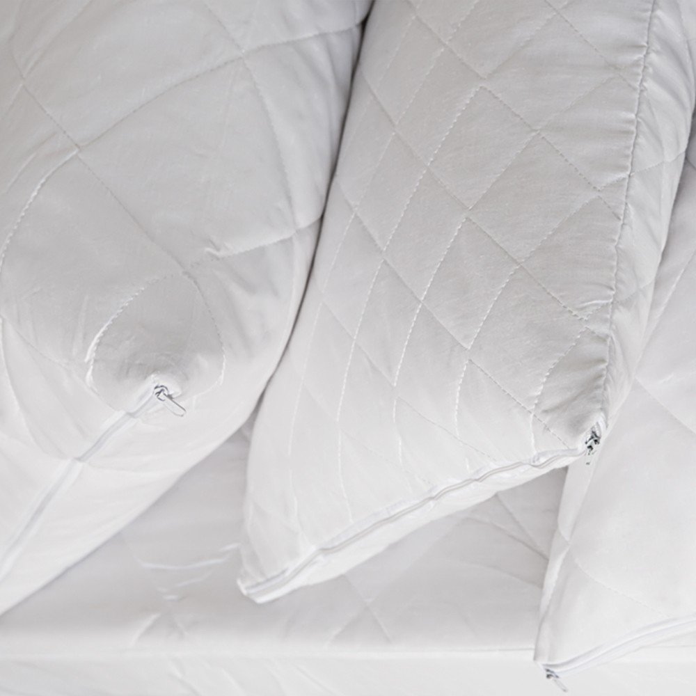 Προστατευτικές μαξιλαροθήκες με υφασμάτινη εξωτερική επιφάνεια, καπιτονέ ραφή & γέμιση 80 gsm. Εσωτερικά διαθέτει αδιάβροχη μεμβράνη πολυουρεθάνης PU για άριστη προστασία των μαξιλαριών σας από λεκέδες, υγρασία & μικροοργανισμούς. Κλείνουν με φερμουάρ για σταθερή εφαρμογή.